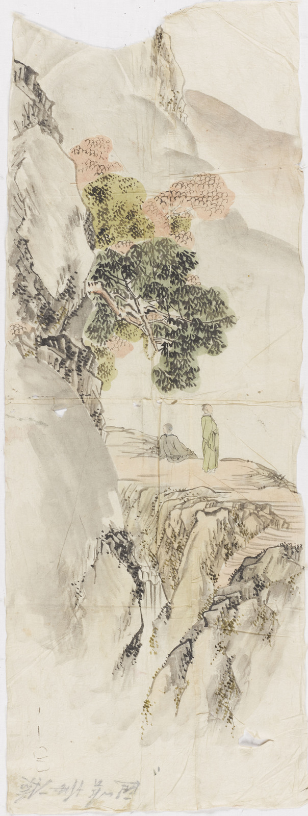 | 解説 | 画の模写と考えられますが、原作者は不詳です。画題について、画中に岩上に立って上方を眺める人物が見えることなどから、中国・日本の文人画の画題として知られる、高士(世俗を離れて暮らす高潔な人物)が岩によって瀑布を観る「観瀑図」と推定しました。本品自体に滝は描かれませんが、あるいは本品(の原本)と対になるもう一幅に滝が描かれていたのかも知れません。 |